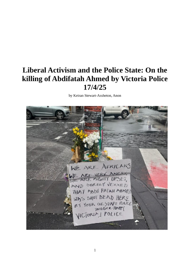 Liberal Activism and the Police State: Yillamin Episode on the Killing of Abdifatah Ahmed by Victoria Police on 17/4/25 Posted on 2025/08/19 - 2025/12/08 by zinesquatteshoppe read print